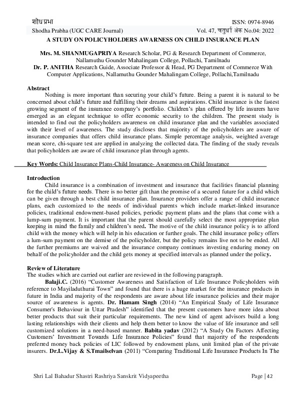 File #1674: "A STUDY ON POLICYHOLDERS AWARNESS ON CHILD INSURANCE PLAN.pdf"