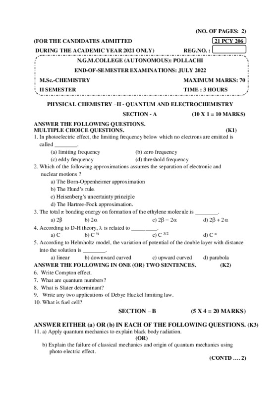 File #168: "21PCY206-PHYSICAL CHEMISTRY –II - QUANTUM AND ELECTROCHEMISTRY.pdf"