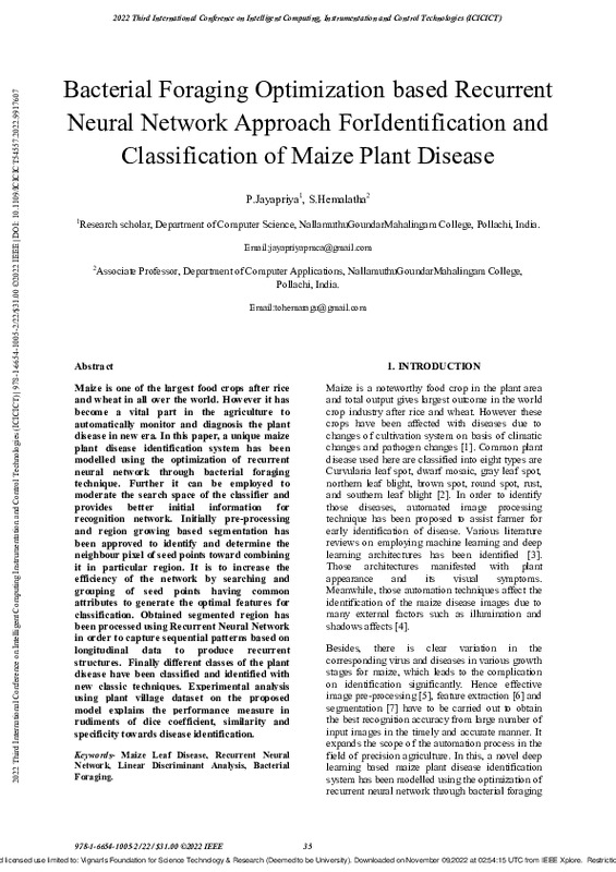 File #1775: "Bacterial_Foraging_Optimization_based_Recurrent_Neural_Network_Approach_ForIdentification_and_Classification_of_Maize_Plant_Disease.pdf"