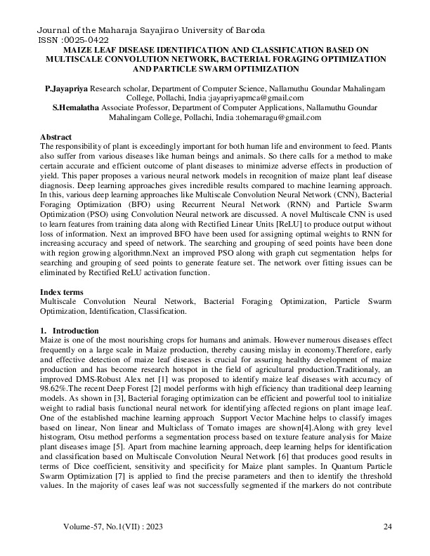 File #1781: "Maize Leaf Disease Identification and Classification based on Multiscale Convolution Network, Bacterial Foraging Optimization and Particle Swarm Optimization.pdf"