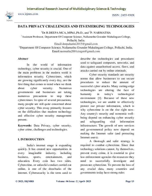 File #1980: "DATA PRIVACY CHALLENGES AND ITS EMERGING TECHNOLOGIES.pdf"