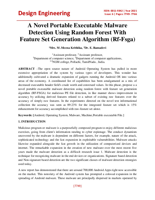 File #1994: "NOVEL PORTABLE EXECUTABLE MALWARE DETECTION USING RANDOM FOREST WITH FEATURE SET GENERATION ALGORITHM (RF FSGA).pdf"