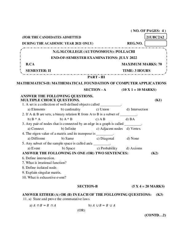 File #219: "21UBC2A2 - MATHEMATICS II – MATHEMATICAL FOUNDATIONS OF COMPUTER APPLICATIONS.pdf"