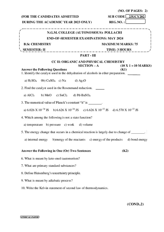 File #2394: "23UCY202-ORGANIC AND PHYSICAL CHEMISTRY.pdf"