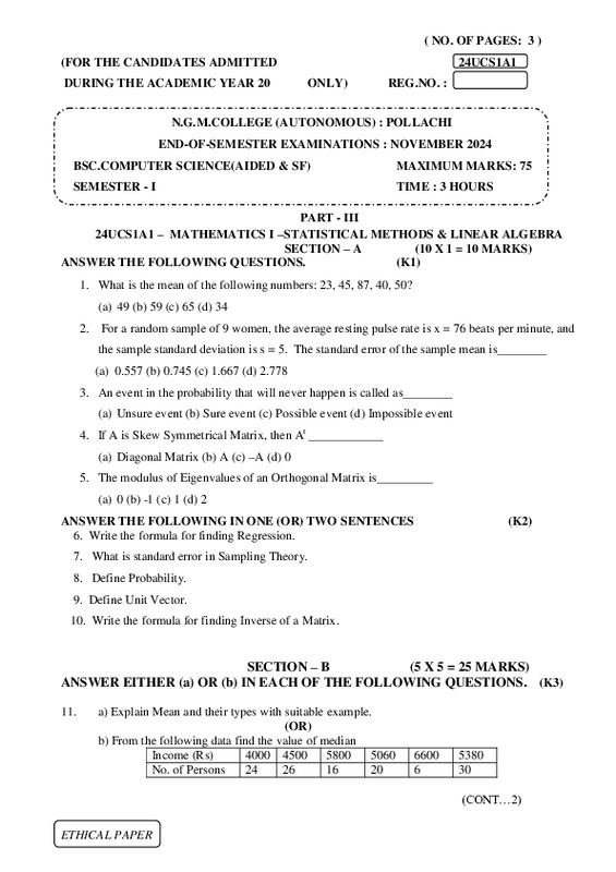 File #2853: "24UCS1A1 – MATHEMATICS I –STATISTICAL METHODS & LINEAR ALGEBRA.pdf"