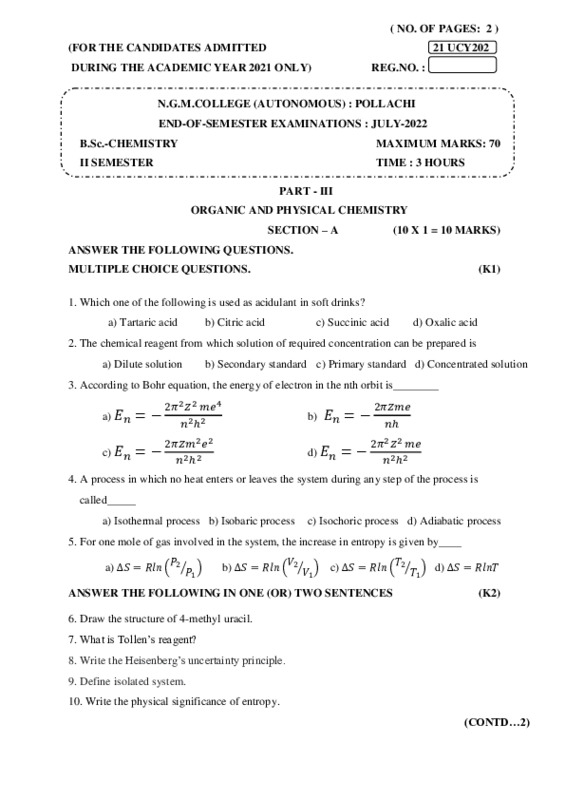 File #32: "21UCY202-ORGANIC AND PHYSICAL CHEMISTRY-ESE.pdf"