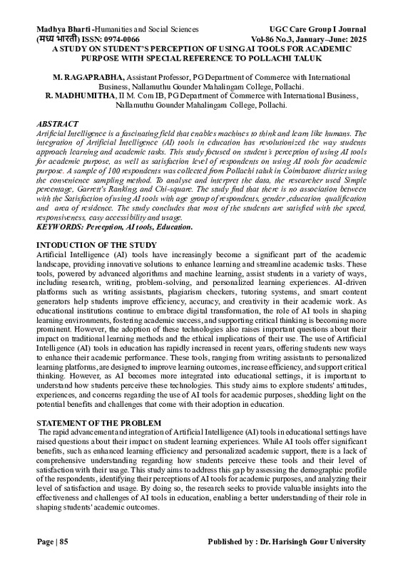 File #3504: "A Study on Student’s Perception of Using AI tools for Academic purpose with Special reference to Pollachi Taluk.pdf"