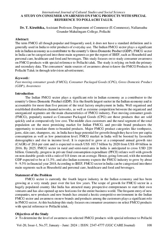 File #3618: "A STUDY ON CONSUMER AWARENESS ON FMCG PRODUCTS WITH SPECIAL.pdf"