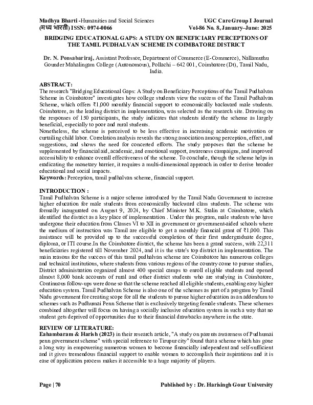 File #3906: "BRIDGING EDUCATIONAL GAPS A STUDY ON BENEFICIARY PERCEPTIONS OF THE TAMIL PUDHALVAN SCHEME IN COIMBATORE DISTRICT.pdf"
