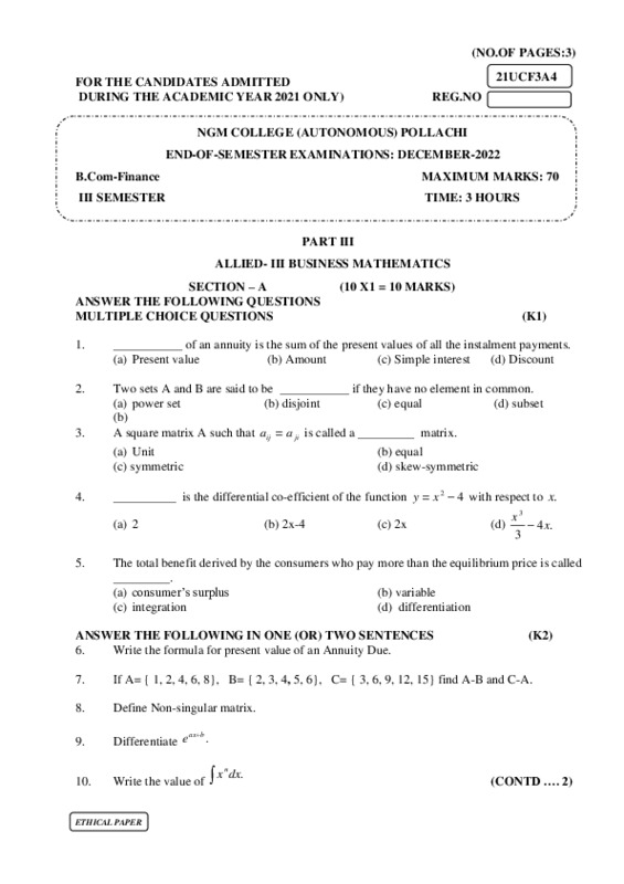 File #876: "21UCF3A4-ALLIED- III BUSINESS MATHEMATICS.pdf"